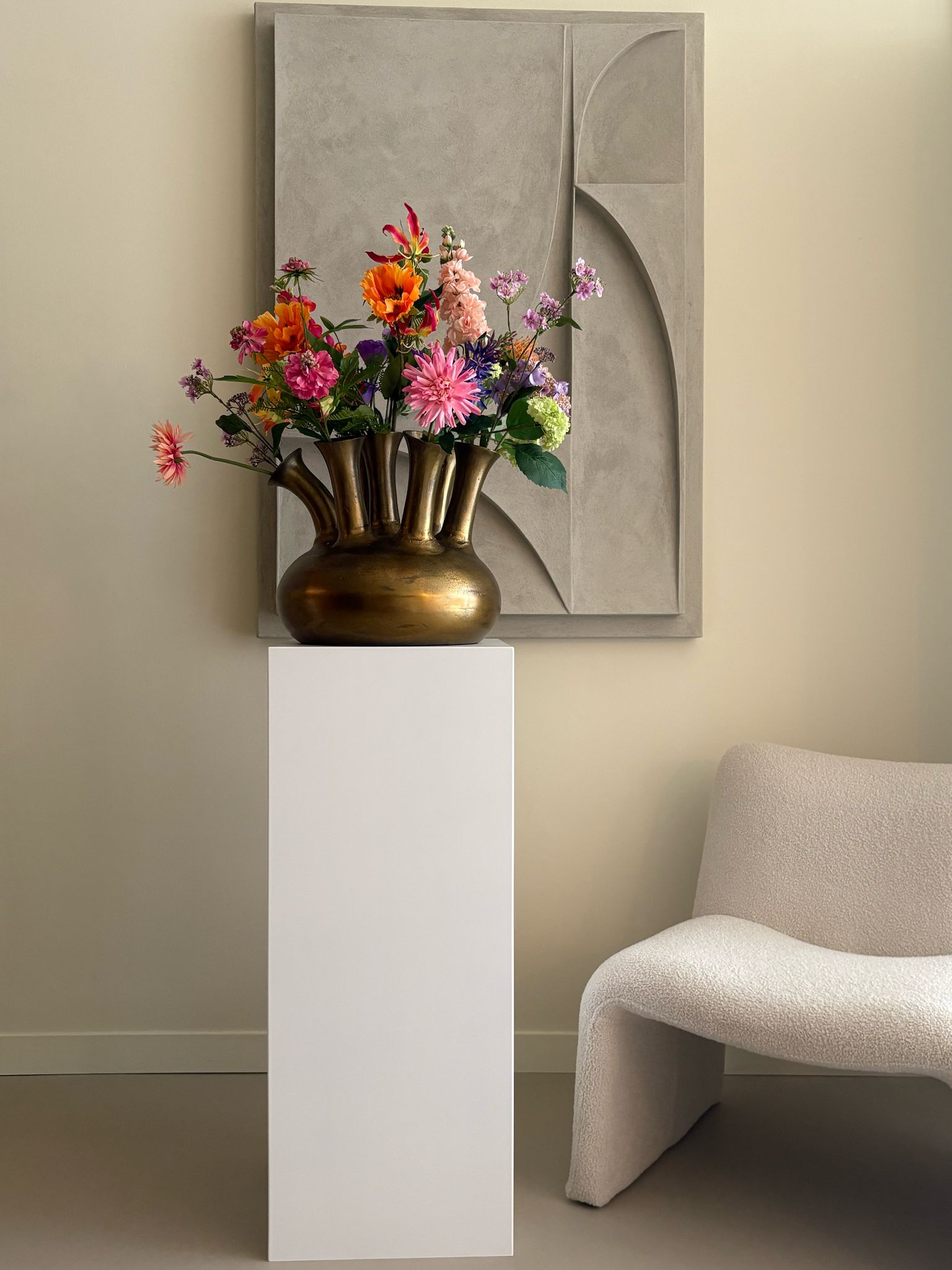 Licht, luchtig en een tikkeltje eigenzinnig –Soléne brengt de zon naar binnen. Met haar speelse mix van gele accenten, frisse groentinten en zachte witte bloemen is dit boeket een subtiele blikvanger. Net even anders, zonder te overheersen. Perfect voor wie houdt van eenvoud met karakter.